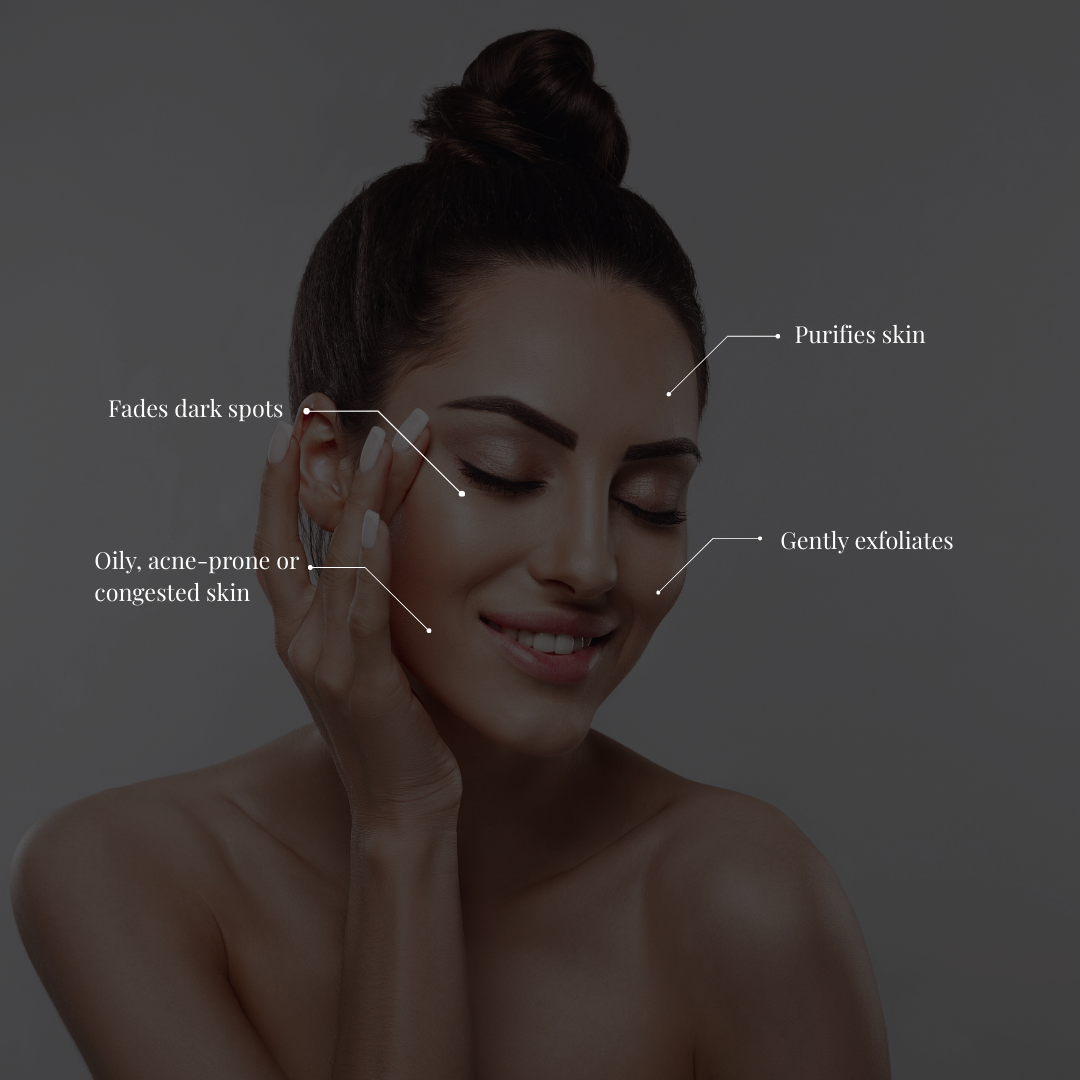 Benefits : Removes dirt & toxins Gently exfoliates dead skin Fades dark spots & blemishes Clears congested pores