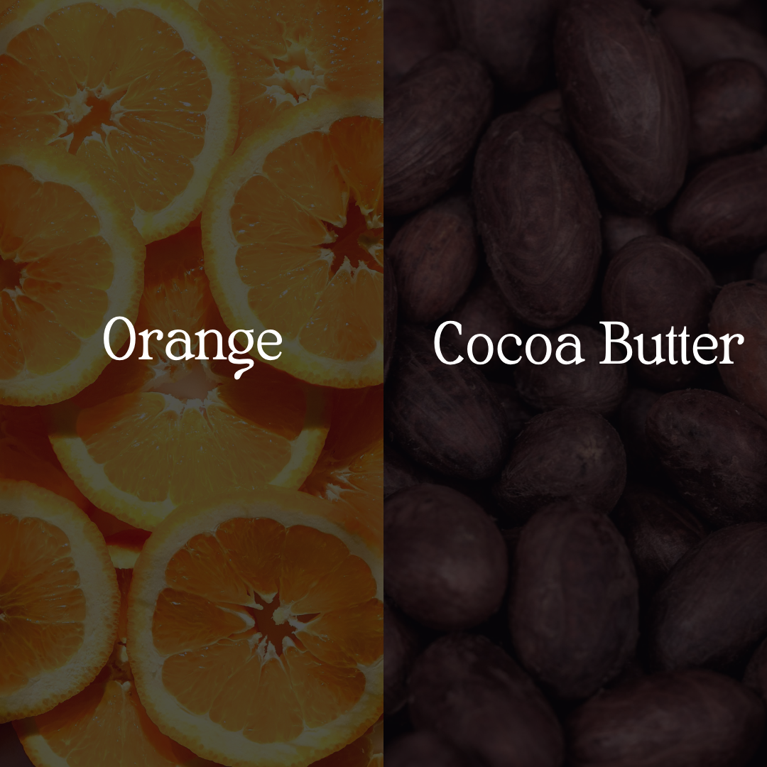 Key ingredients : Orange – refreshing & revitalizing Cocoa Butter – deeply moisturizing Shea Butter – protective & nourishing