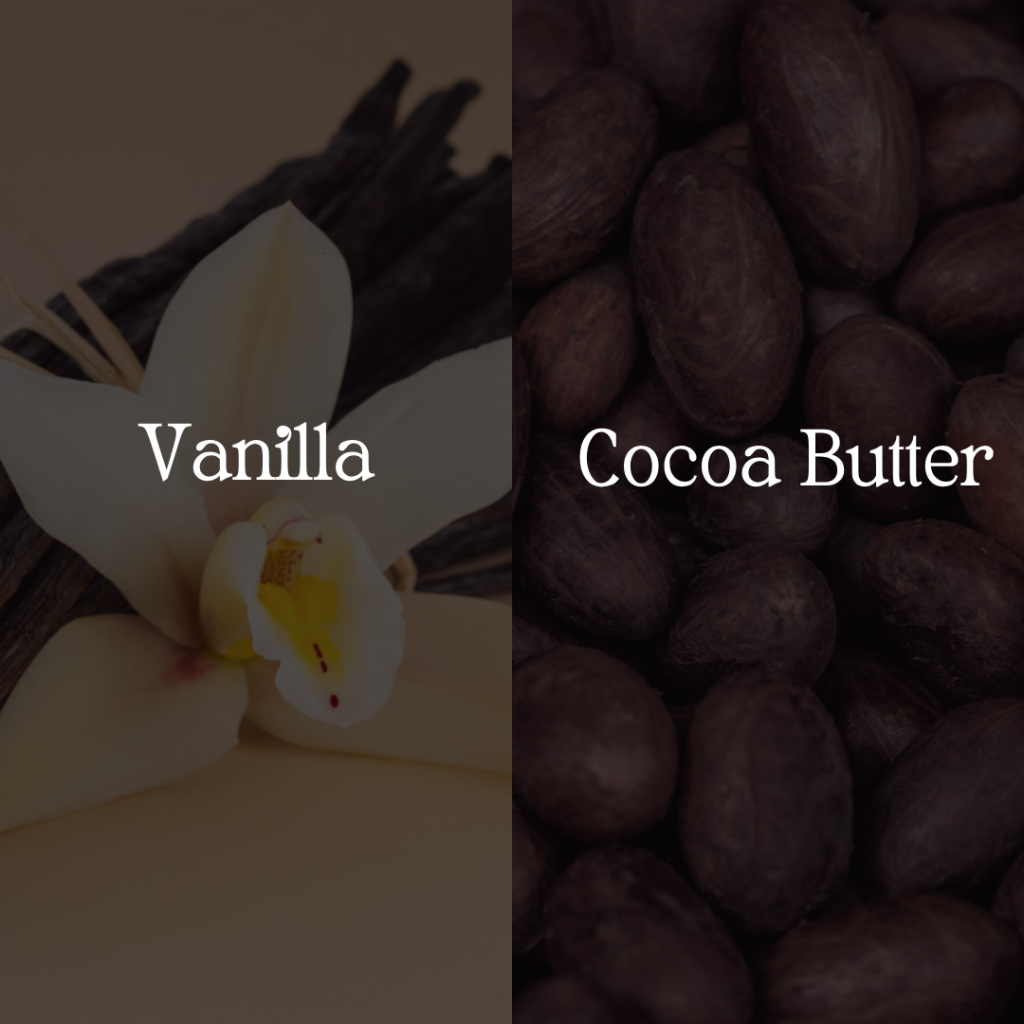 Key ingredients : Vanilla – soothing & calming Cocoa Butter – hydrates & heals Shea Butter – locks in moisture