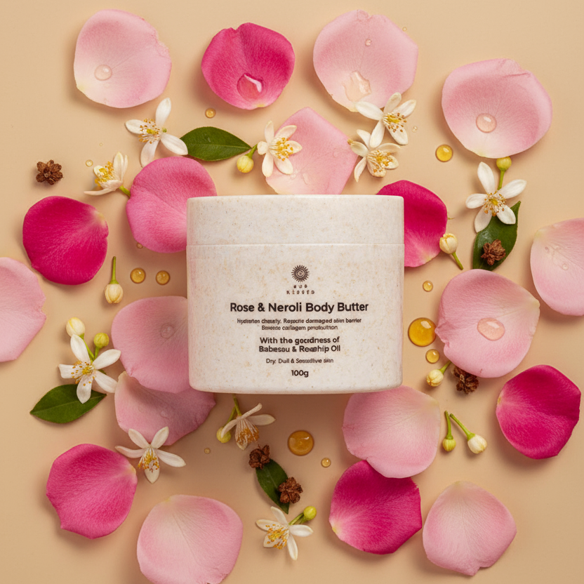 Think of this as a hug for your skin. With the delicate blend of rose and neroli, this body butter deeply hydrates, repairs damaged skin barriers, and boosts collagen. The result? Velvety-soft skin that feels nourished, pampered, and lightly kissed with a floral fragrance.