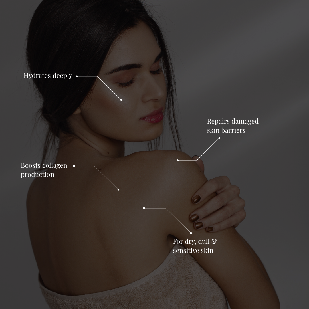 Benefits : Deep hydration & nourishment Repairs skin barrier Boosts collagen production Perfect for dry, dull & sensitive skin